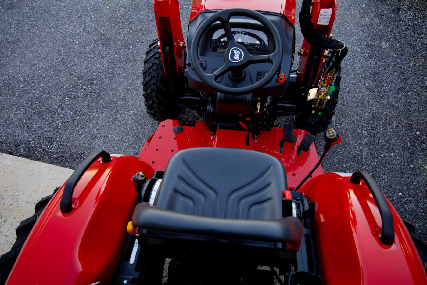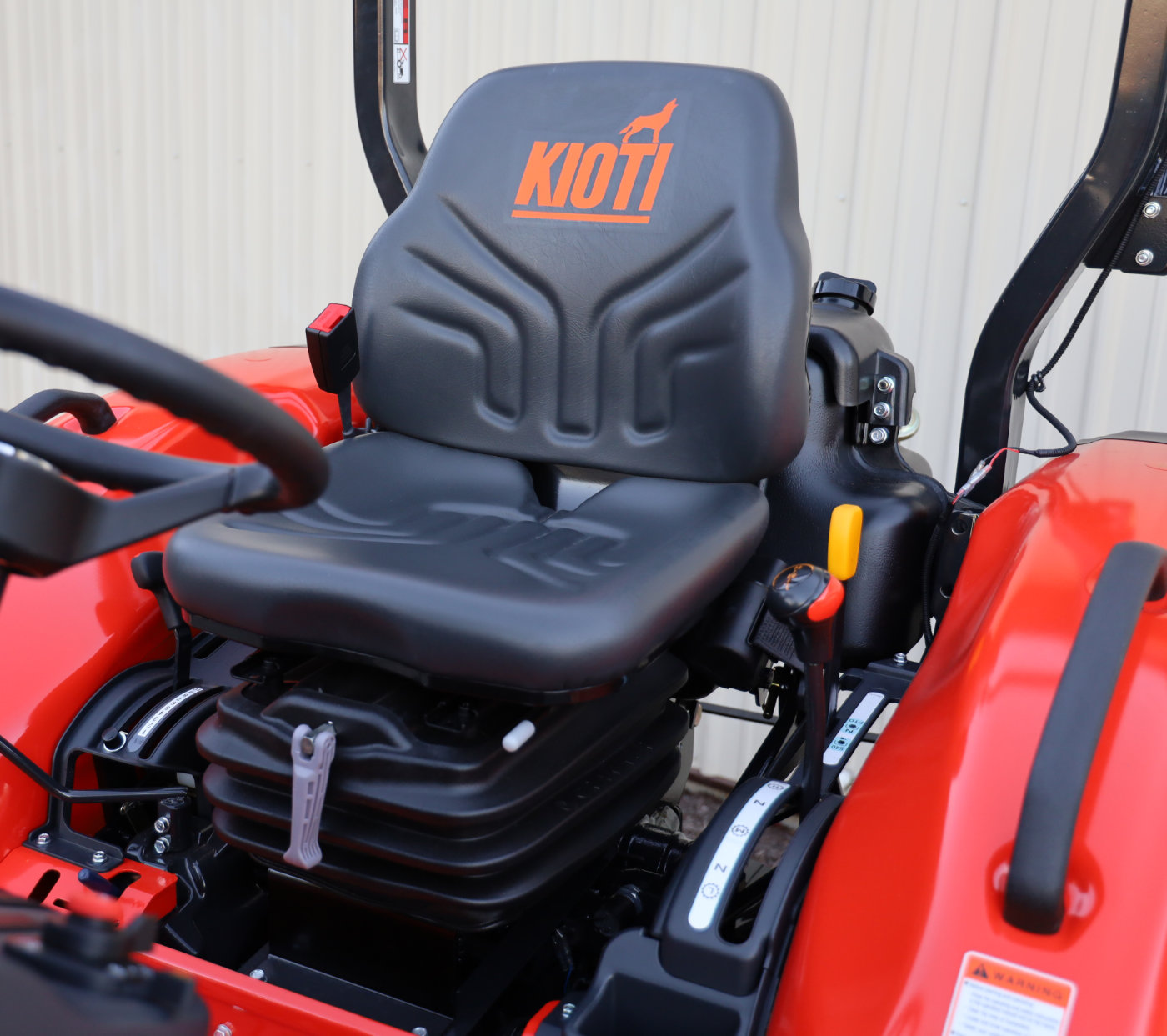 - Deluxe Seat: A fully adjustable suspension seat allows the operator to ride in comfort no matter what the job. A retractable seatbelt is standard on all KIOTI tractors to ensure operator safety.